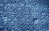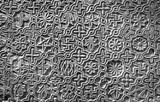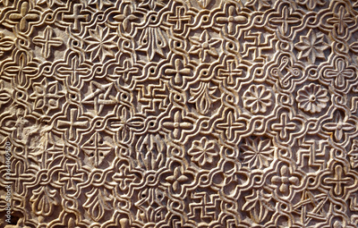 Byzantine patterned ornament carved in stone wall, ancient texture background, detail of interior with geometric relief.