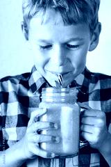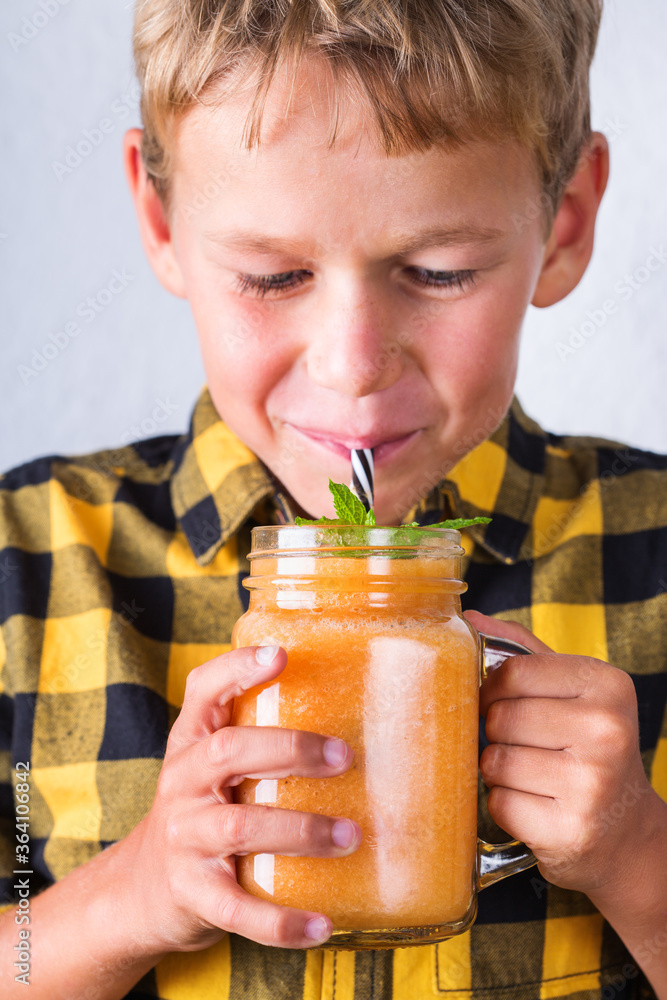 Happy boy drinking healthy smoothie with straw, enjoying and smiling
