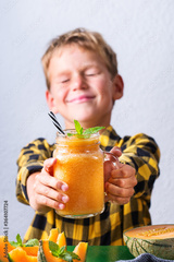Happy boy drinking healthy smoothie with straw, enjoying and smiling
