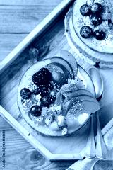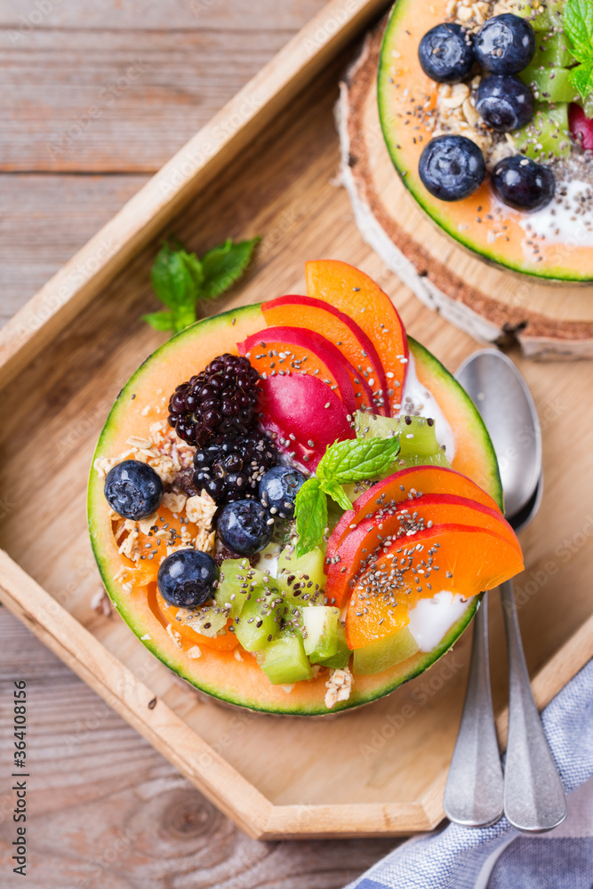 Fruit salad with yogurt in carved melon cantaloupe bowl