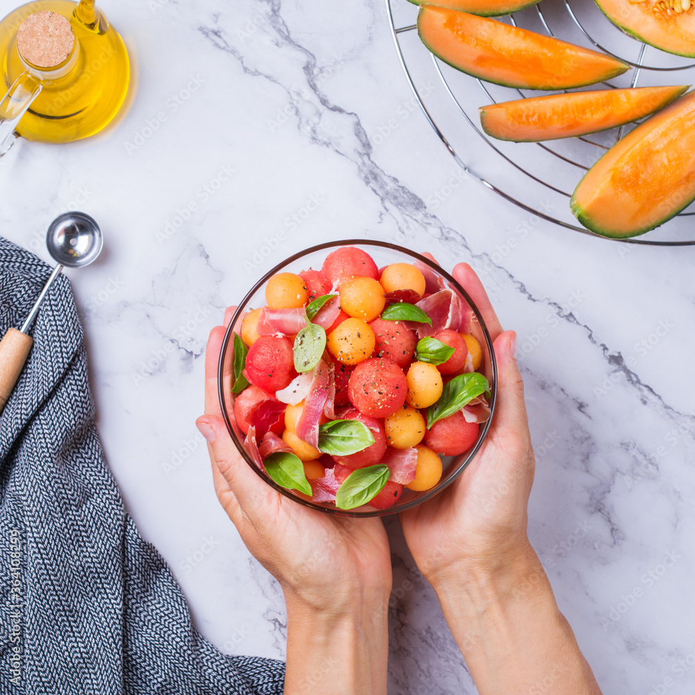 Fruit salad with melon cantaloupe, watermelon and prosciutto