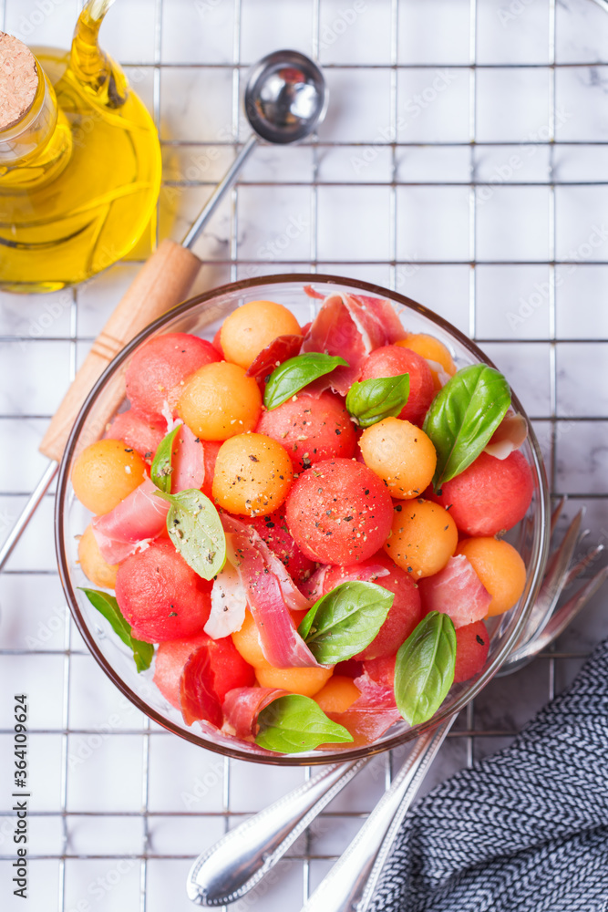 Fruit salad with melon cantaloupe, watermelon and prosciutto