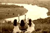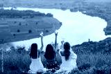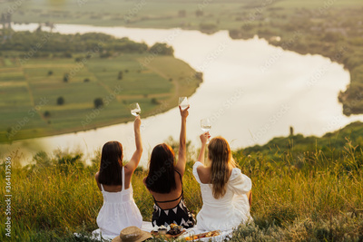 Three female friends sitting on the grass on the hill and having fun. View from behind. Young girlfriends having a picnic with river background.