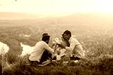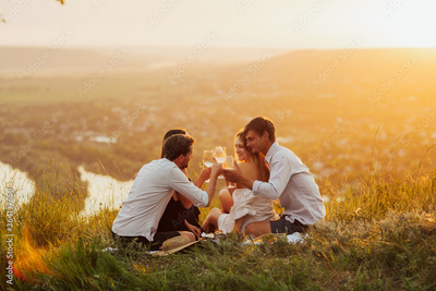 Couples having a picnic in the countryside. People with glasses of white wine on the background of river at the picnic. Cute couples looking at each other against the backdrop of the river and sunset.