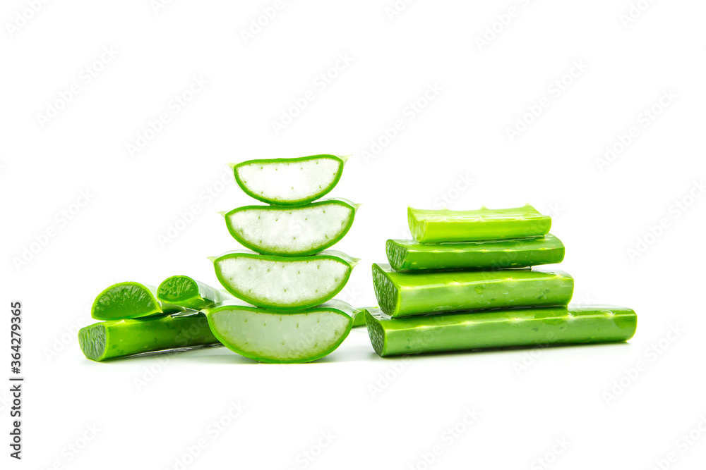 Slices of fresh aloe vera plant stacked and aloe vera stalk or leaves with water dropping isolate on white background.