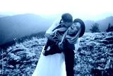 Groom hugging his bride and kissing her neck and she is laughing. mountains on background.
