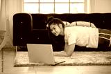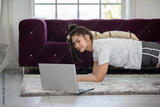 Attractive Asian woman looking laptop practice yoga plank online course at home to meditation comfortable and relax