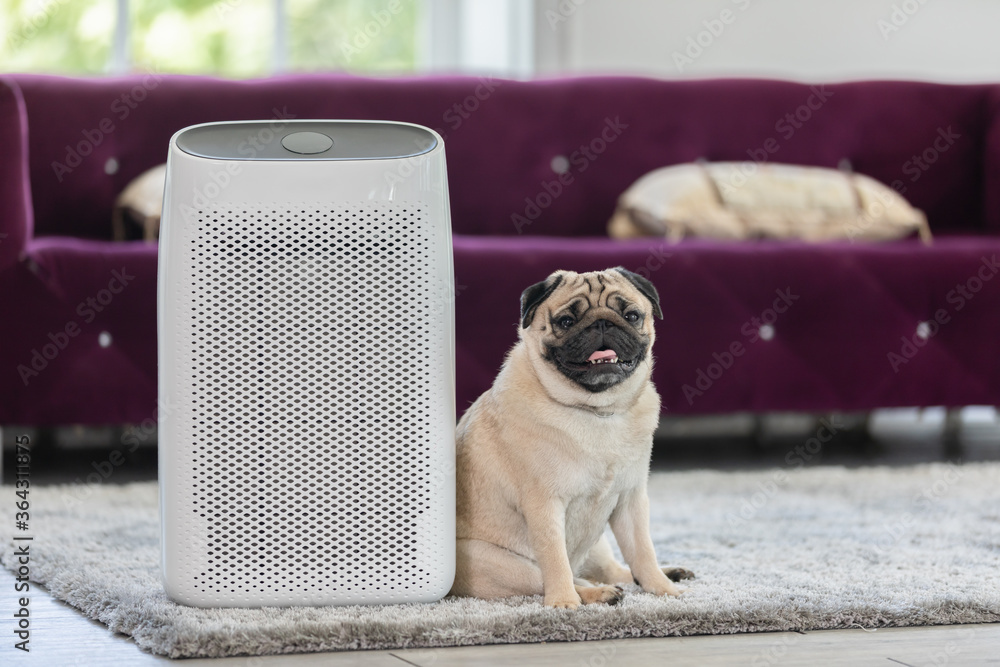 Dog Pug Breed and Air purifier in cozy white Living room for filter and cleaning removing dust PM2.5 HEPA in home,for fresh air and healthy life,Air Pollution Concept