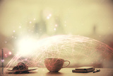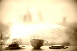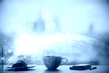 Double exposure of social network theme drawing hologram over coffee cup background in office. Concept people connection.