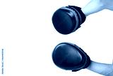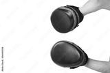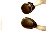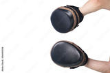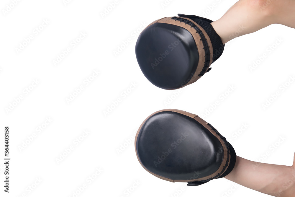 close-up, two hands with paws for training, sports, Boxing, on a white background, close-up, there is a place for the inscription, top view