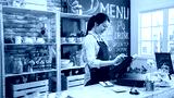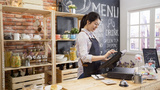 smiling coffee shop assistant using pos point of sale terminal to put in order from note paper at restaurant register. waitress lady working in counter in cafe store. young girl staff using cashbox.