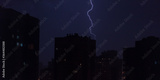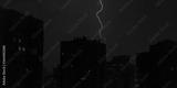 lightning storm in night black and blue sky over city with dark resindential silhouettes