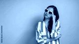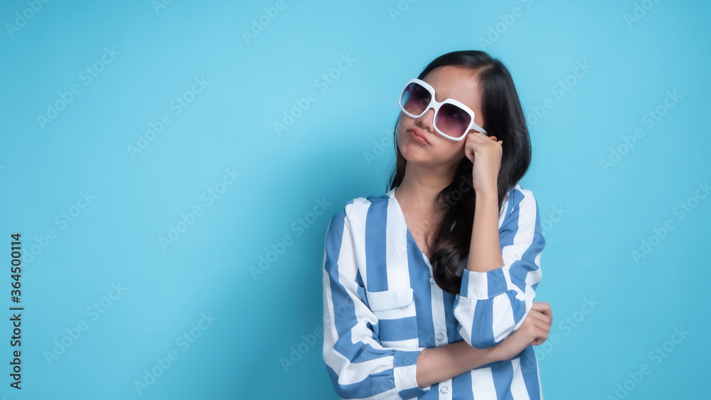 Portrait of young beautiful Asian woman wearing white glasses relax and innocent.cute girl think and consider somethings in studio on blue background.
