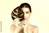 Portrait of beautiful young woman with perfect skin holding monstera leaf on beige background
