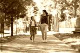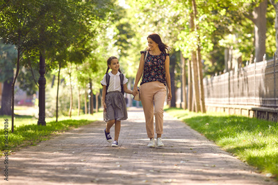Smiling girl holding hands with her mom while walking to school. Back school.