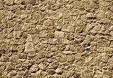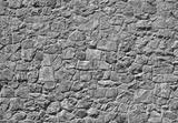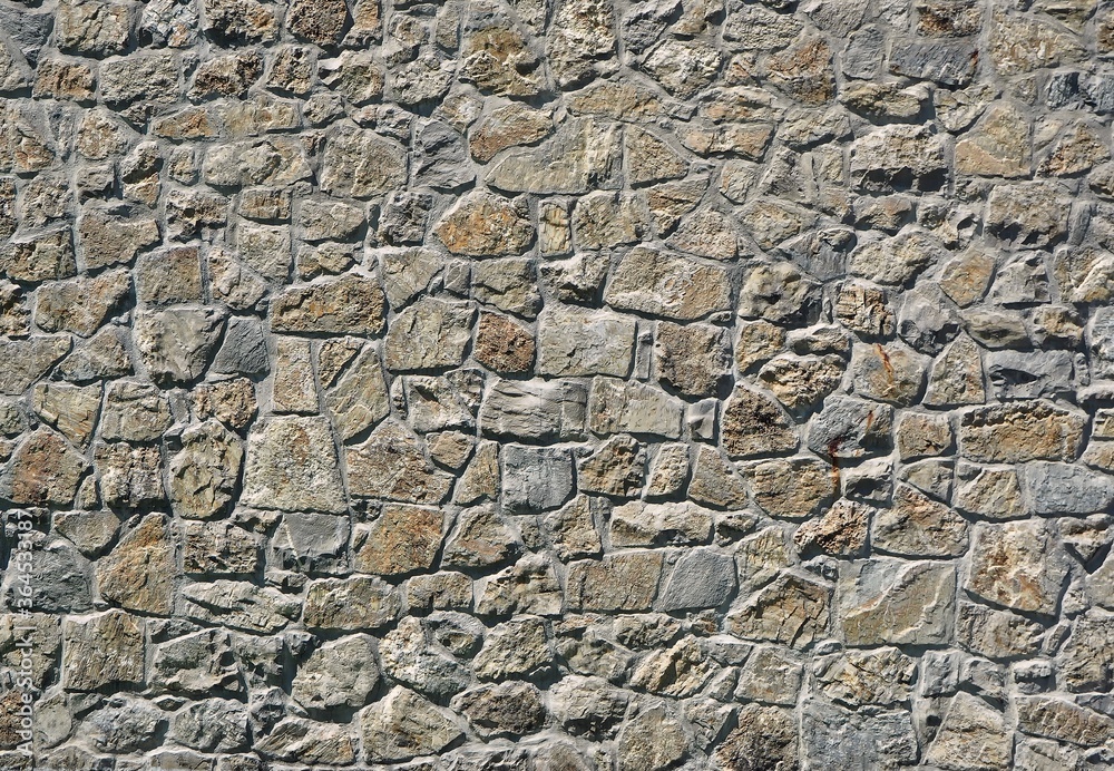 Massive stone wall made of gray and brown rocks with irregular shapes. Background and texture