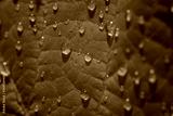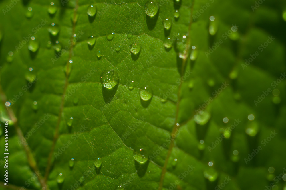 macro photo of leaf of grape with rain drops lighted by sun. Abstract background, nature, mood