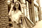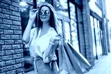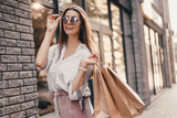 Beautiful smiling woman with shopping bags walking near mall on the street.