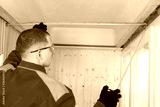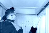 a master in a blue uniform and black gloves measures the distance between the window and the wall with a yellow meter