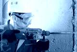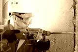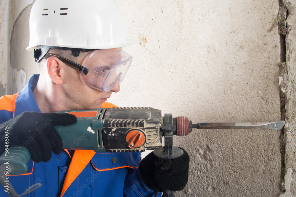 cleaning the walls of old concrete, for applying new plaster, using a hammer, workers in protective clothing, glasses and a hard hat, close- up