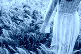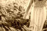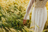 Beautiful woman walking in field and touching wheat. She standing with his back in a wheat field, touching wheat ears with hand.