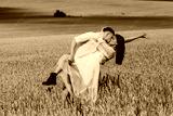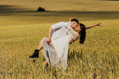Stylish couple kissing at a gold wheat field. The concept of youth, love and lifestyle. Couple having fun and enjoying relaxation in a wheat field. Girlfriend and boyfriend kissing and hugging.