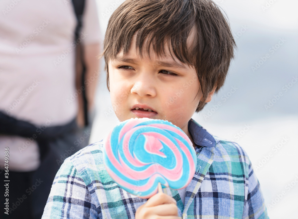 cute kid eating lollipop, happy little boy holding big sugar candy, Child with smiling face eat sweets, Active childhood enjoying funtime outdoor in sunny day summer