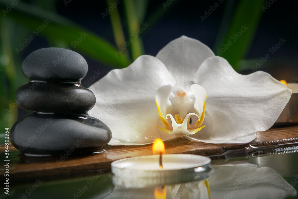 Black zen stones,candles and white orchids on a wooden plank on the surface of the water. SPA, relaxation, meditation concept