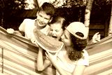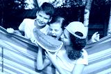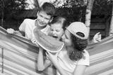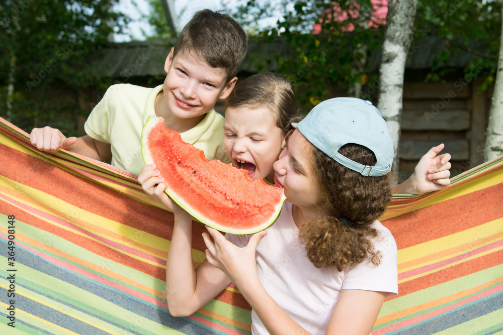 children eat watermelon and joke, in the fresh air, sitting on a hammock