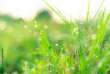 Blurred fresh green grass field with raindrops in early morning. Water drops on green grass leaves in garden. Green grass leaves with bokeh background and sunlight. Nature background. Rainy season.