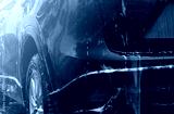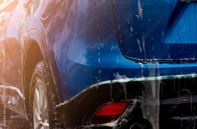 Blue car wash with white soap foam. Auto care business. Car cleaning and shining before waxing service. Vehicle cleaning service with antiseptic and disinfection of coronavirus (COVID-19). Carwash.