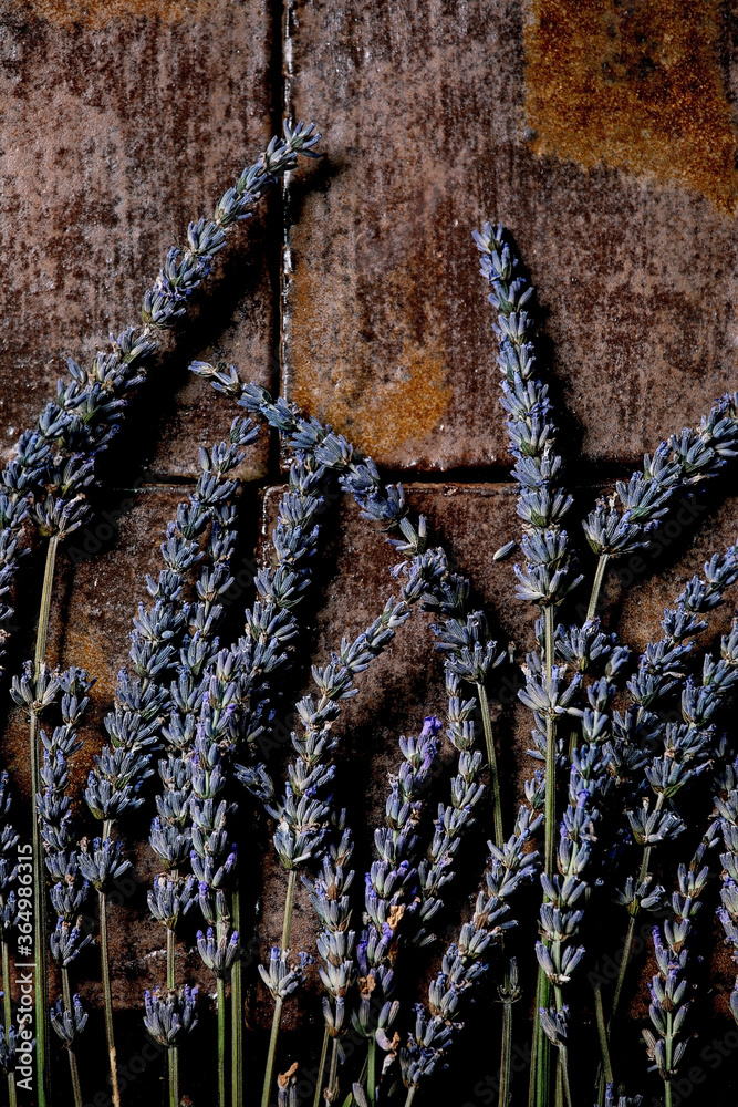 Fresh and dry lavender flowers over dark brown ceramic tile. Flat lay, space