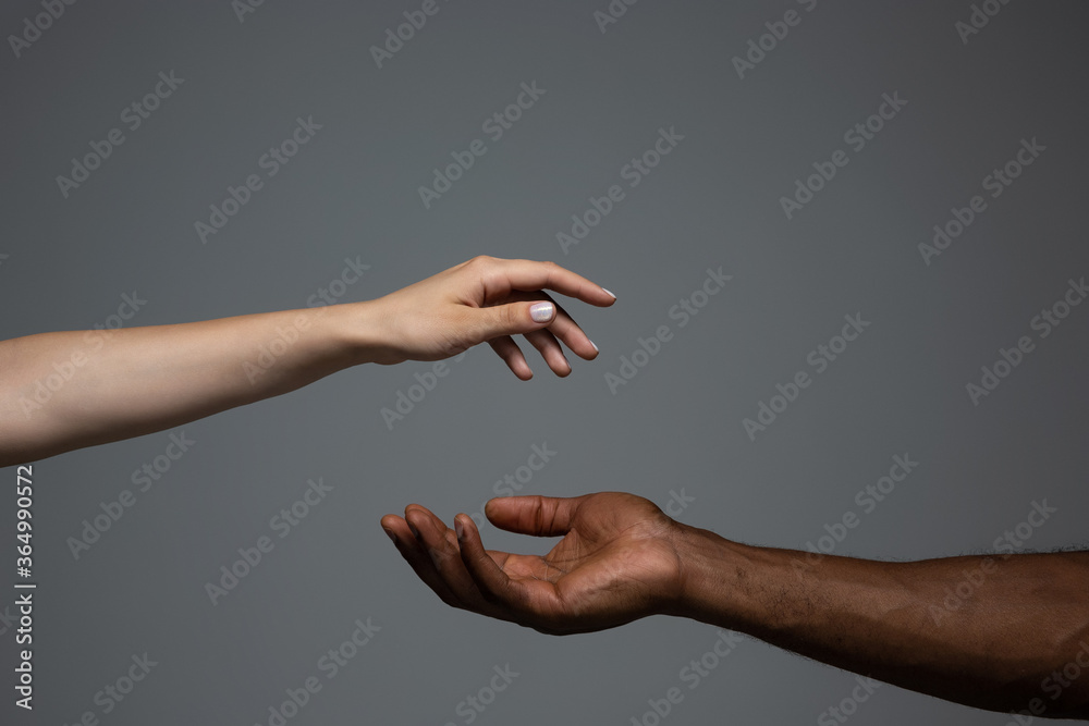 Touch of God. Racial tolerance. Respect social unity. African and caucasian hands gesturing on gray studio background. Human rights, friendship, intenational unity concept. Interracial unity.