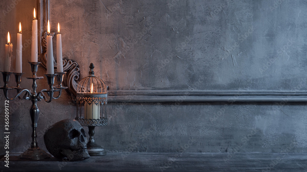 Mystical Halloween still-life background. Skull, candlestick with candles, old fireplace. Horror and witchery.