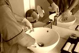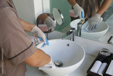 Cleaning and disinfecting bathroom surfaces against Corona virus with spray detergent, rubber gloves and dish cloth. COVID-19 prevention sanitizing inside.