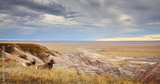 Bighorn sheep overlook plains of the Badlands National Park at sunset, South Dakota, USA.