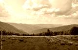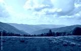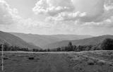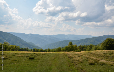 Beautiful view of fir trees and green meadow in the Carpathian mountains against sky with clouds, Ukraine