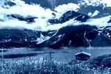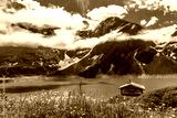 Mooserboden alpine lake in the Austria alps with wooden house and low clouds and blooming flowers in front