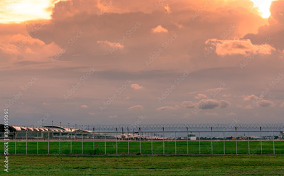 Landscape of green grass field and fence of the airport and beautiful sunset sky. Commercial airplane parked at apron of airport. Coronavirus impacted aviation business. Fence for safety and security.