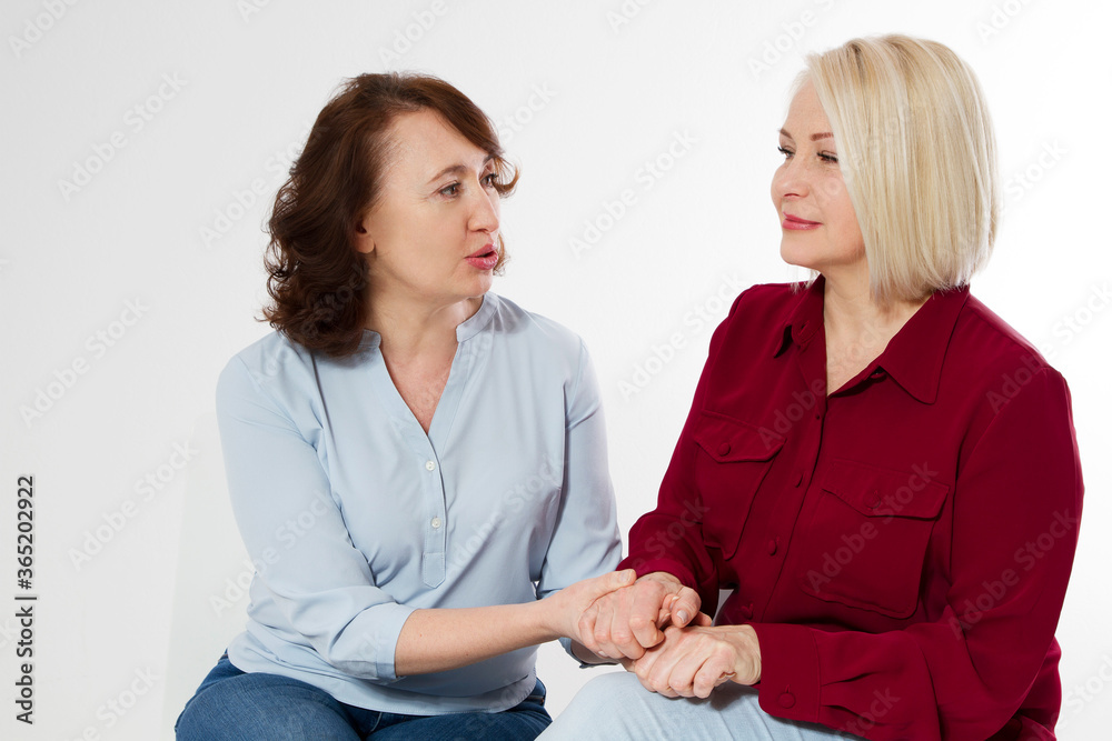 Happy menopause concept. Two healthy and beautiful middle aged women isolated on white background. Woman support woman. Closeup faces and skincare makeup.