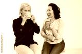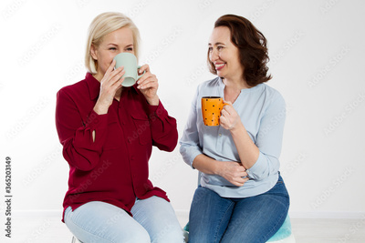 Two healthy and beautiful middle aged women drinking tea and talking isolated on white background. Woman support woman. Happy menopause concept.