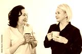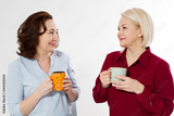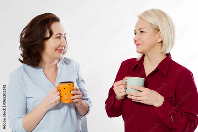 Two healthy and beautiful middle aged women drinking tea and talking isolated on white background. Woman support woman. Happy menopause concept.