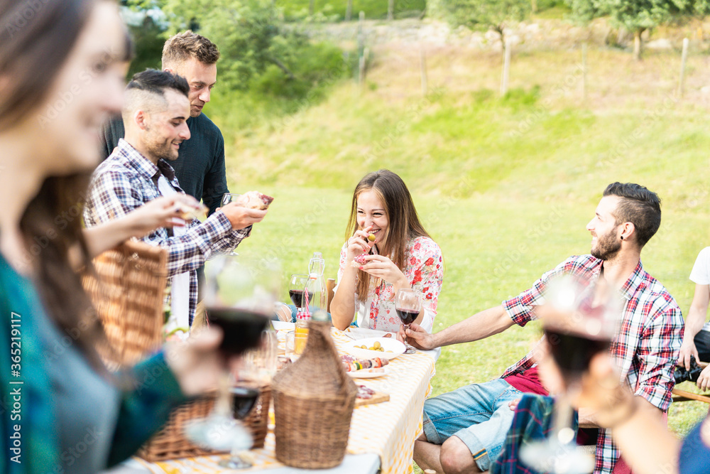 Happy young friends drinking wine and eating appetizer at outdoor dinner with vineyard in background - Adult people having fun in nature - Friendship and summer meal concept - Main focus on blond girl