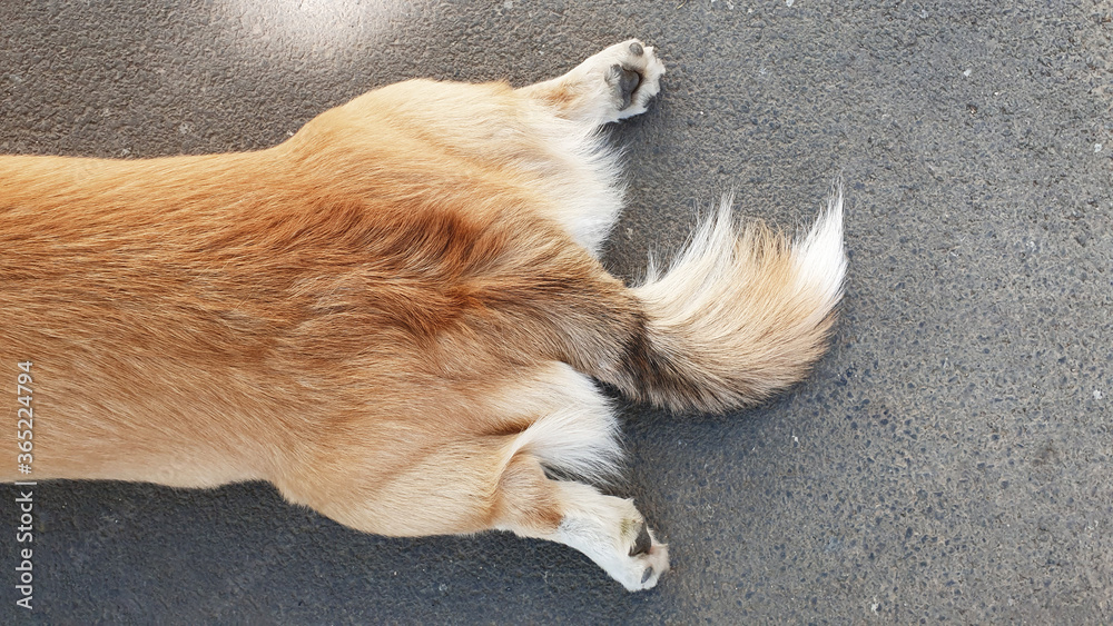 Pembroke Welsh Corgi, Welsh Corgi portret. Lifestyle Purebreed The dog lies on the asphalt with his hind legs stretched out