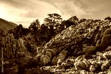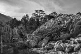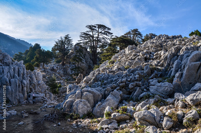 Green meadow with cedar trees and mountain rocks on famous tourist path Lycian way in Turkey
