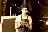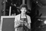Young toughtful curly italian male waiter with food on tray serving at restaurant outdoor.Side jobs in bakery shop. Family business concept.