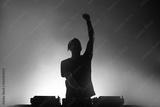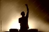 Disc jockey silhouette dressed in black playing music on a white wall in a smoky setting.