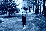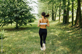 Female runner running outdoor in nature. Young woman jogging in morning in park. Slim sports woman running in summer green park. Female athlete jogging in forest. She doing morning physical training.