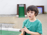 Outdoor portrait of active kid boy lookig out with surprised face, Happy Child carrying toy playing outside in sunny day summer. Positive children concept