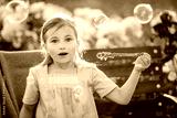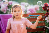 girl blows soap bubbles on the background of flowers in the garden. On the face of emotions of surprise and admiration.